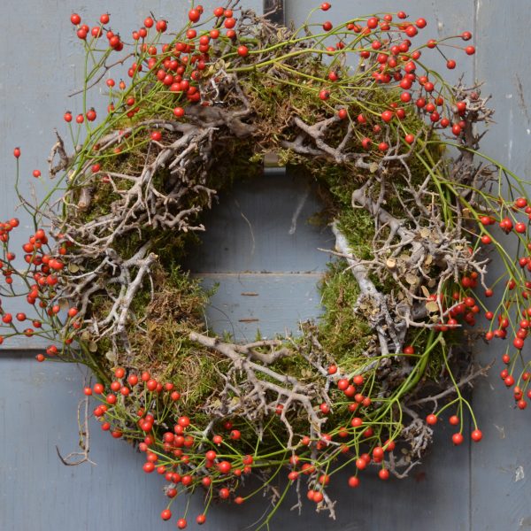 Eenvoudige mooie krans. Materialen: mos, bonsaitakjes en rozenbottels. Op de foto een krans van 30 cm. De krans is niet geschikt voor buiten.